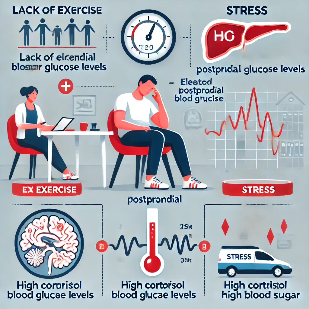- 운동 부족: 운동을 하지 않으면 신체가 혈당을 효과적으로 에너지로 사용하지 못하게 됩니다. 이로 인해 혈당이 높게 유지됩니다.